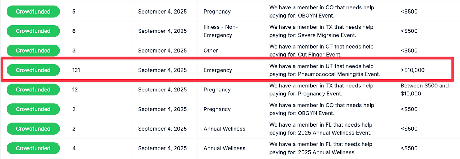 You can also see everything that was funded. Like this example of a Pneumococcal Meningitis Event where over $10,000 was funded by spreading it out across 121 members.