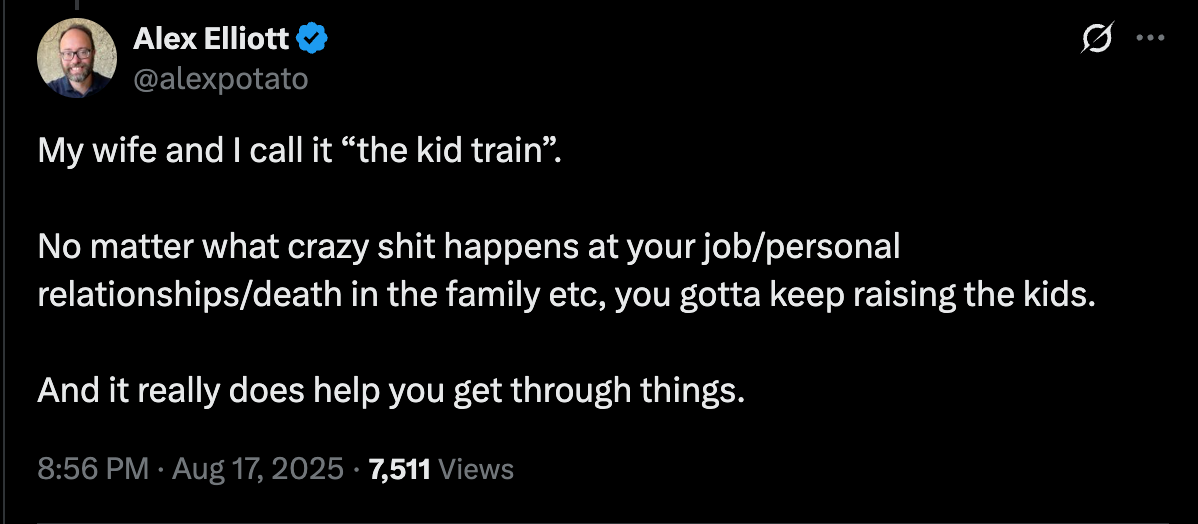 The acute and chronic challenges of having kids have never felt close to either of these. And a core part of why it’s felt so much easier is that even in its hardest moments, you are being pulled through the challenges of raising kids. You aren’t having to push.